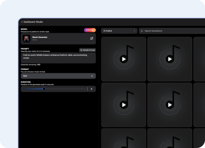 Generate a soothing music piece with calming tones, gentle harmonies, and soft instrumentals for a relaxing ambiance.Design an epic music composition with dramatic crescendos, powerful orchestration, and vibrant soundscapes for an impactful experience.Create a dynamic music track with upbeat rhythms, catchy melodies, and energetic beats to energize and engage your audience.