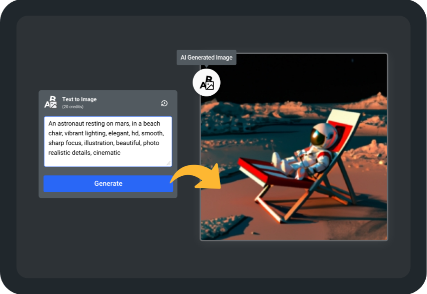 Convert textual description into visual content while incorporating creative expression, design, and content generation with the advantage of AI technology. Enjoy the advantage of versatile Text to Image generation from art and design to visual storytelling.