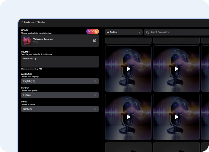 The voiceover to your project by selecting the desired gender and vocal style, offering flexibility and personalization to meet your specific needs.