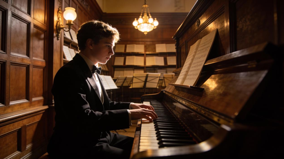 A young man sits at a piano, playing calmly and confidently. His posture is relaxed and natural, with both hands resting clearly on the keys. As he plays, his fingers move smoothly across the keyboard in a steady rhythm. He slightly sways with the music, occasionally lowering his gaze toward the keys. His expression is focused and peaceful. The camera holds a stable medium shot, keeping his upper body, hands, and the piano keys clearly visible. Soft ambient lighting creates a warm, intimate atmosphere. Gentle piano music plays in sync with his movements, conveying a calm and emotional mood.