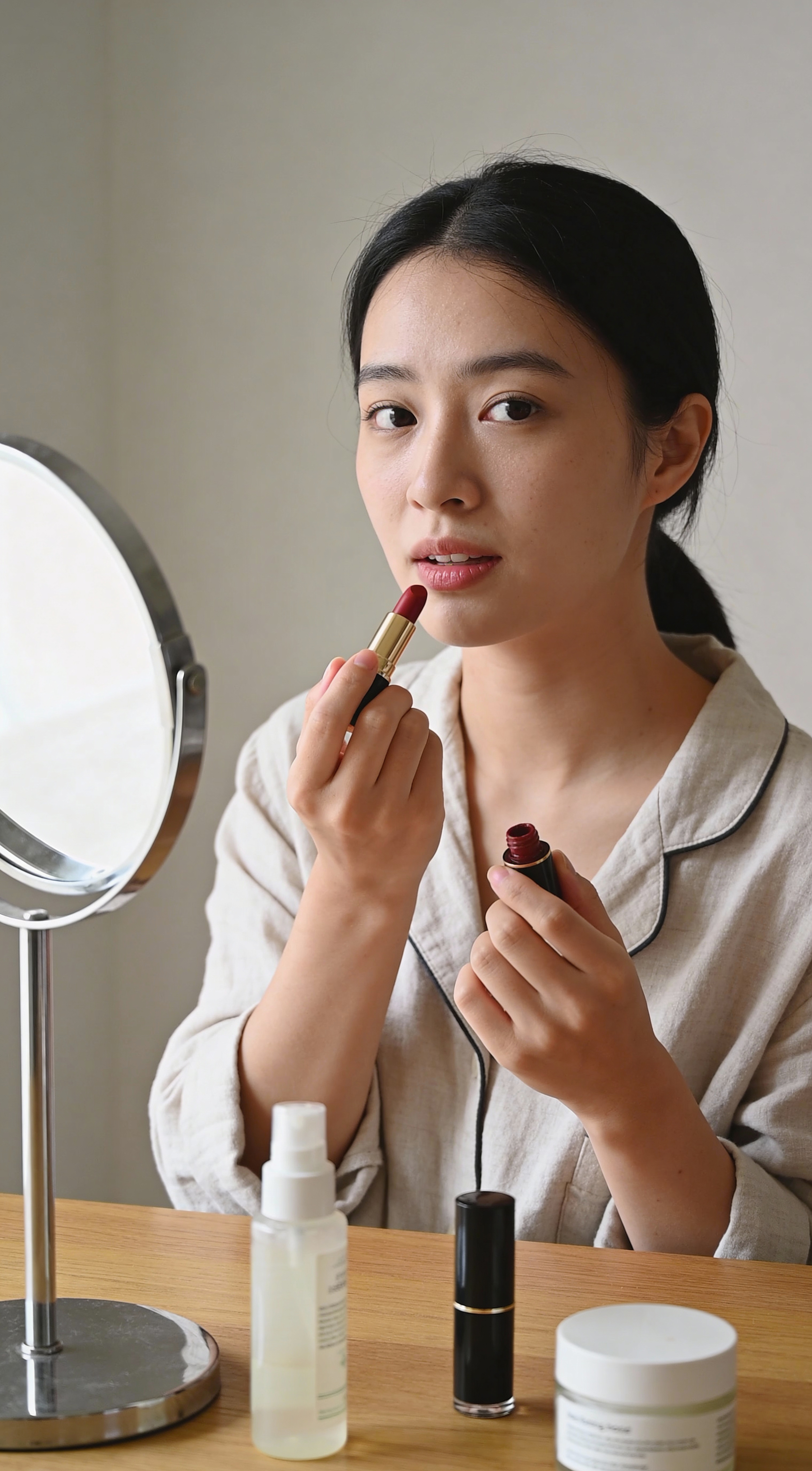 Generate a realistic and natural lipstick trial video. After application, the model gently presses lips together and slightly adjusts angle, making lip color changes clearly visible in natural light, finally switching camera, left-right split screen comparison of before and after makeup effects.