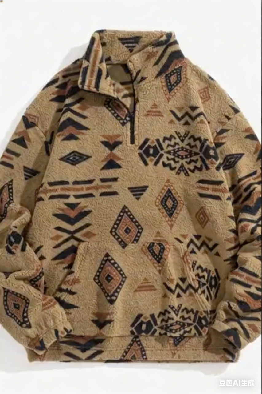 Product reference from @Image1, audio references child's voice timbre from @Video1 0-3 seconds opening: Fixed position close-up, solid color background. Plush sprites in stop-motion animation walking in neat formation, suddenly a real-shot lambswool ethnic print zip hoodie "slides" into frame like a fish, sprites attracted by silky texture, curiously jump on hoodie. Screen displays "Unique Ethnic Patterns!", cheerful electronic music plays, voiceover says "Cultural twist meets cozy winter style!", sound effects paired with silky "whoosh" sound. 3-7 seconds fabric and print display: Close-up shot, sprites use small fans to lightly brush hoodie, plush fabric ripples, highlighting soft texture; camera quickly switches, showing 3 different print hoodie close-ups, corresponding print sprite makes cheering, jumping stop-motion actions. Screen presents "Plush Material - Soft & Warm", voiceover introduces "Plush fabric keeps you cozy all cold days!", sound effects include fabric fluttering sounds, and "bang" sound with each print switch. 7-11 seconds function and fit: Camera pulls to medium shot, sprites pull hoodie zipper, then take out small props from hoodie pocket, directly presenting zipper and pocket functions; scene cuts to faceless model wearing hoodie, model raises hands to stretch body, showing hoodie's loose fit. Screen displays "Functional Pocket + Loose Fit", voiceover says "Zip closure, handy pocket & free movement!", sound effects include zipper sliding sound and "boing" elastic sound. 11-13 seconds promotional info: All sprites line up, playfully pointing to screen center, background switches to solid color. Screen displays "BLACK FRIDAY SALE!", voiceover prompts "Grab this unique piece at unbeatable price!", sound effect is sprites making cute cheering sounds, paired with loud promotional alert sound. 13-15 seconds ending call: Screen center is neatly stacked hoodie real image, website link marked beside, all sprites peek out from screen edges waving. Screen displays "Shop Now! [www.yourbrand.com]", voiceover says "Add cultural charm to your winter wardrobe!", music ends with bright, complete notes.