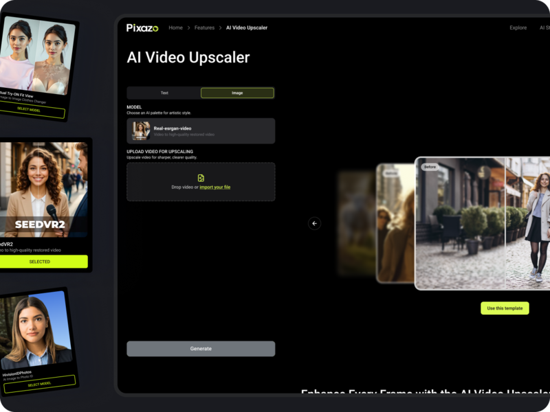 Accelerate your workflow and cut down on expensive reshoots with intelligent video enhancement. Pixazo’s AI ensures exceptional results in seconds—so you can focus on creation, not correction.